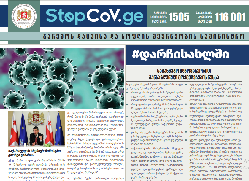 - დეტალური ინფორმაცია ახალი კორონავირუსის გავრცელების პრევენციის მიზნით სამინისტროს მიერ განხორციელებული ღონისძიებების შესახებ;